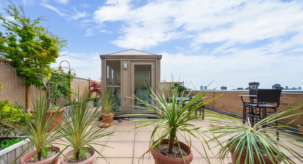 A fantastic layout with split bedrooms, separate dining area, southern light, open views, and a 1000 sq ft private terrace makes this 1052 sq ft condominium feel like a home. With hardwood floors throughout, this two- bedroom two-bathroom condominium features a separate dining area which could also function as a home office, custom window treatments, an abundance of closets with custom build outs and up-graded bathroom are just a few of custom upgrades the owners have made. Enjoy the 1000 + sq ft landscaped roof garden boasts an automatic irrigation system, which offers places to lounge and places to entertain while enjoying the view for miles. The kitchen features a contemporary cabinetry, glass subway tiled back splash, granite countertops and stainless-steel appliances make it easy to whip up a meal or enjoy the abundance of eateries the area has to offer. The B & C trains are just on the corner, and the 2 & 3 trains 1 block away.
